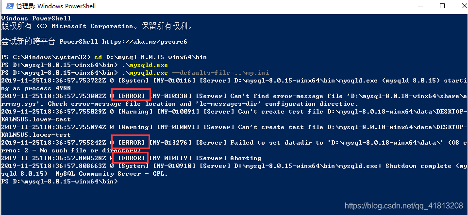 在前面的基础上 将my.ini删除,这样mysqld就找不到数据源,看下它提示了什么错误