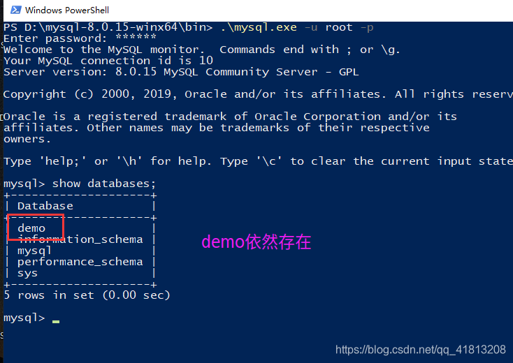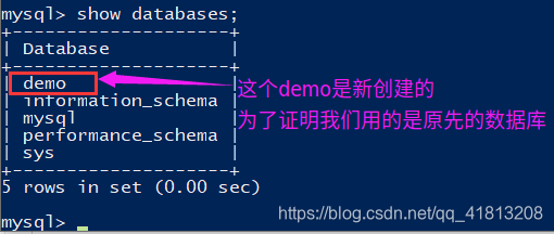 为了实验有效果我们创建一个数据库,这里干脆叫demo(如果你本身有数据库那么更好直接下面实验)