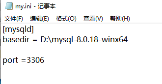 [mysqld]basedir = D:mysql-8.0.18-winx64datadir = D:dataport =3306