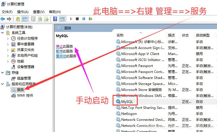 那么先检查一下服务里面有没有mysql服务 此电脑==》管理==》服务和应用程序==》服务 如下图
